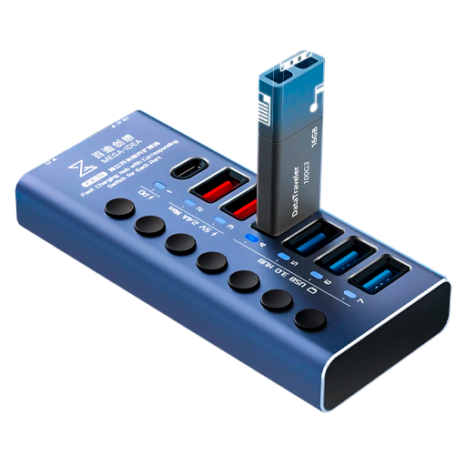 - Funciones principales: permite carga rápida simultánea en hasta 5 puertos, transferencia de datos a alta velocidad de hasta 5 Gbps y visualización en tiempo real del estado de carga mediante pantalla digital LED